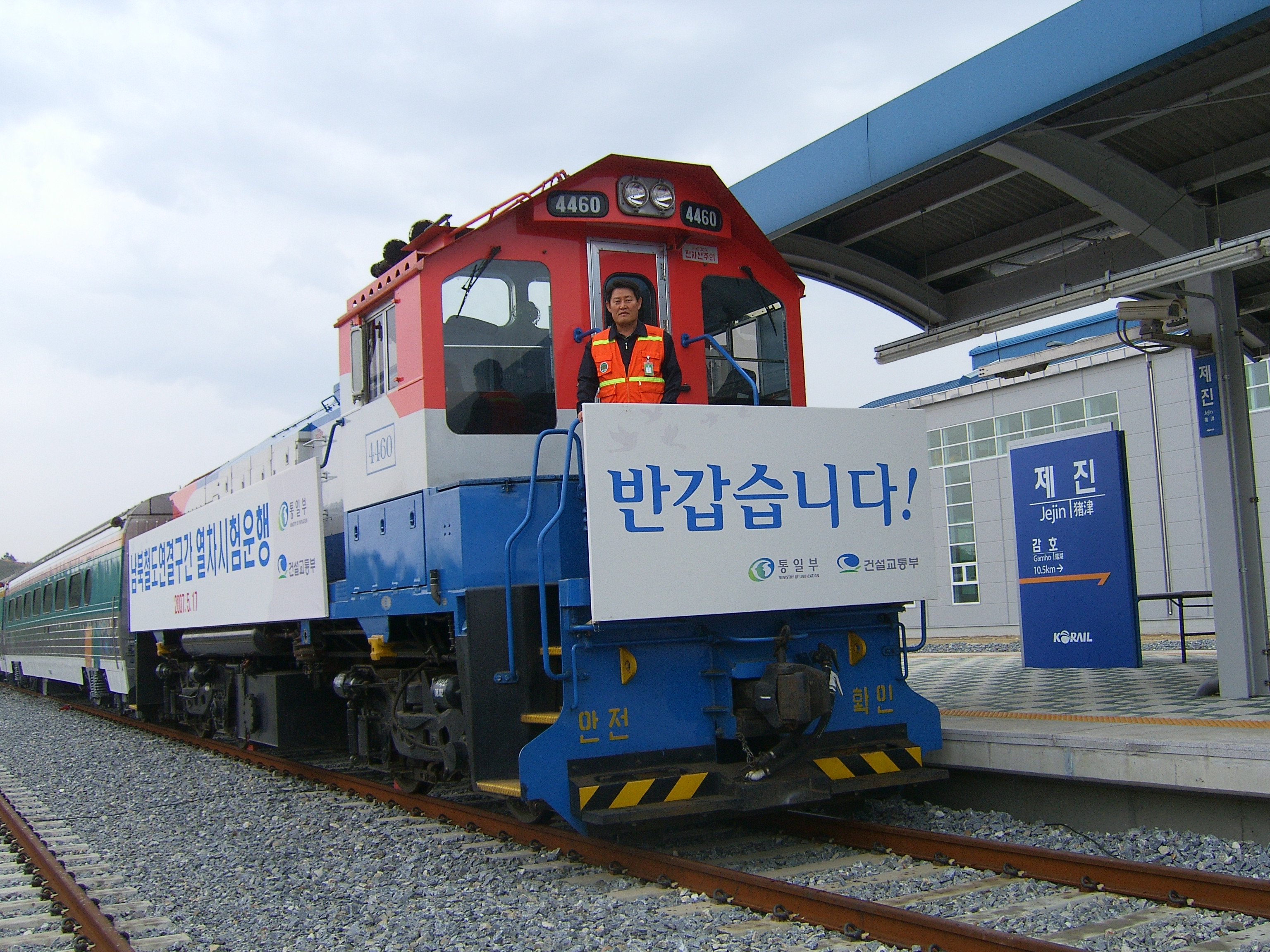 2007년도 제진역에 남북열차의 교류 현장입니다.