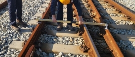 궤간게이지로 선로 궤간, 수평 측정하는 사진입니다.