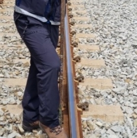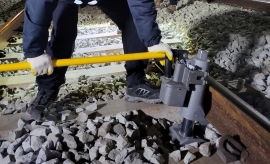 핸드타이탬퍼로 선로 다지는 작업 사진입니다.